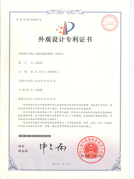 此文關鍵詞:恒溫恒濕試驗箱,恒溫恒濕箱專利證書